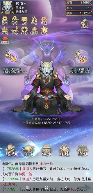 作为新手进入游戏第一件事就是挂机修炼加修为,起初3分钟一次,等到过了开光期之后就可以开启自动修炼,这时候你就可以渡劫和淬体了。